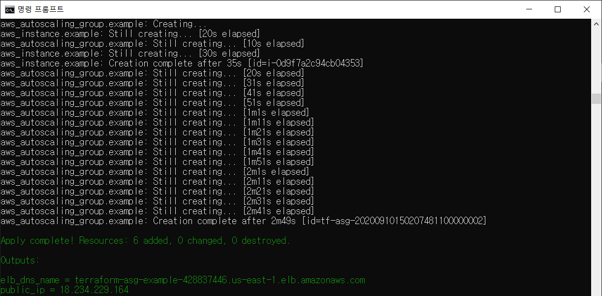 이 사진에서 ELB가 생성되었고 DNS이름이 나온 것을 확인할 수 있다. 이 DNS로 접속하면 ELB를 거쳐 로드밸런싱이 적용되어 ASG에 포함된 EC2 Instance중 하나에게 패킷이 전달된다.