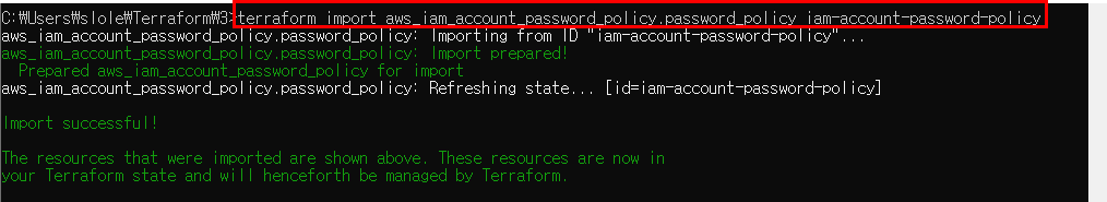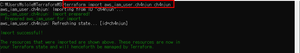 정상적으로 import 명령어가 수행된 것을 확인할 수 있다. 여기서 id는 IAM User의 이름이 사용됬지만, 애매하다면 그냥 단순하게 Resource의 Arn을 사용하면 된다.