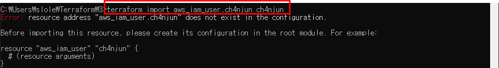 그러나, Terraform의 tfstate파일에는 이러한 정의가 되어있지 않기 때문에 사용자가 있다고 판단하지 않는다. 때문에 ch4njun이라는 사용자의 내용을 수정하고 싶어서 resource를 생성하고 수정하려 해도 없기 때문에 IAM User를 생성하기 위해 동작한다. 그 결과 중복된 IAM User 이름이라는 에러와 함께 실패하게 된다.