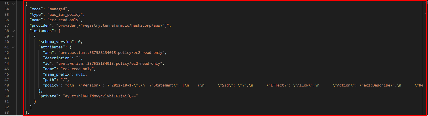 terraform.tfstate 파일에 정상적으로 해당 Resource에 대한 정보가 들어온 것을 확인할 수 있다. 48번째 줄을 확인하면 Policy에 대한 정보까지 확인할 수 있다. 이를 output으로 출력하면 Json 형태로 정책을 확인할 수 있다.