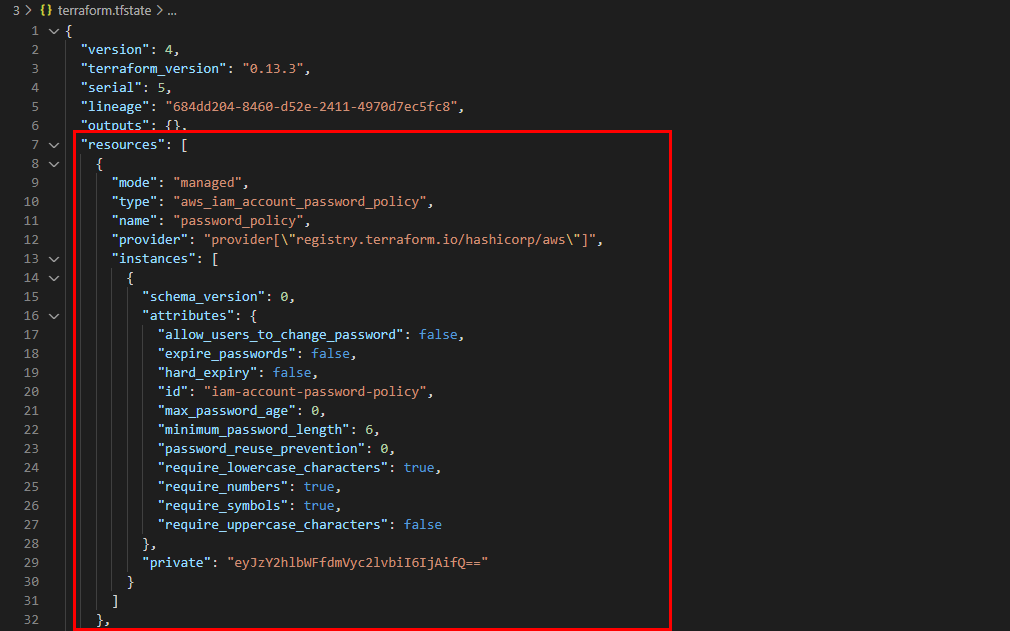 terraform.tfstate 파일을 보면 리소스에 대한 정보가 정상적으로 읽어져온 것을 확인할 수 있다.