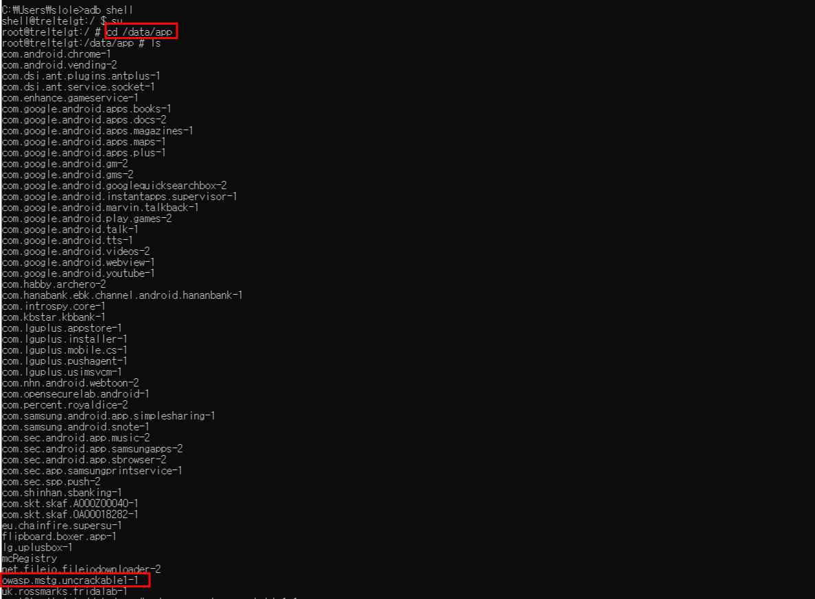 Root 권한으로 /data/app 경로에 들어가면 설치된 Application의 패키지명으로 디렉토리가 나열되어 있는 것을 확인할 수 있다. 이중 추출하고 싶은 Application의 패키지명에 들어간다.