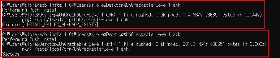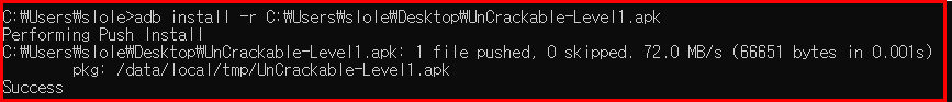 첫 번째 실행은 APK파일에 대한 Application이 이미 설치되어 있을 때 발생하는 에러이다. 해당 Application을 Device에서 삭제하고 다시 수행하니 정상적으로 설치되는 것을 확인할 수 있다.