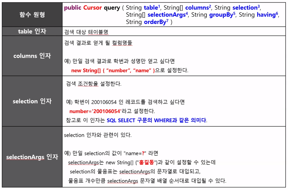 public Cursor query(String[] columns, String selection, String[] selectionArgs,