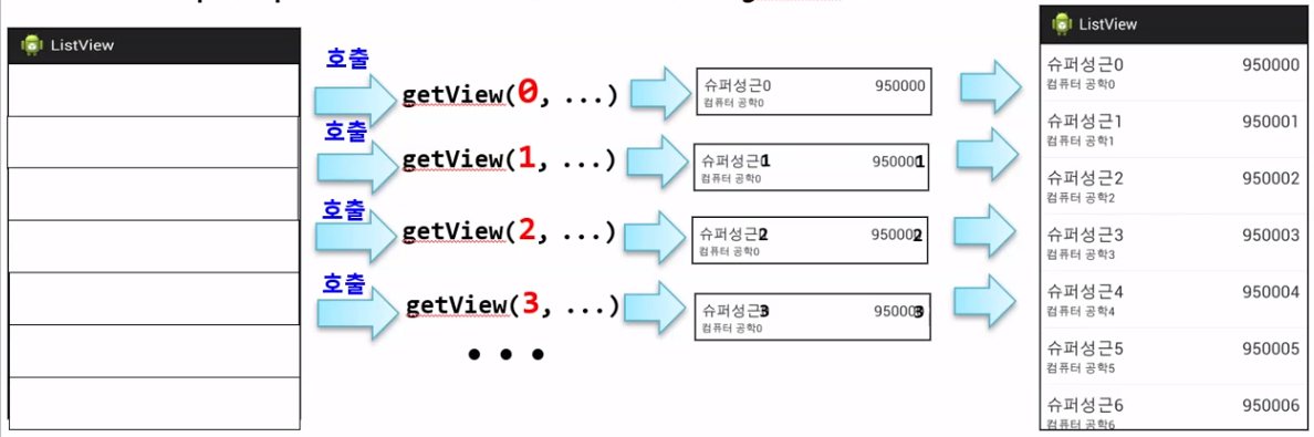 getView 함수는 각 위치에 맞는 Layout(정보가 포함된)를 반환해주고 그걸 List View에 제때제때 할당해주게 된다. 해당 위치가 필요할 때만 getView가 호출되기 때문에 기존 Scroll을 사용할 때의 한계를 개선할 수 있다.