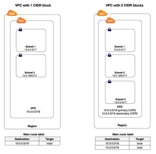 예를 들어, 기본 CIDR 블록이 10.2.0.0/16인 VPC에서 가상 프라이빗 게이트웨이에 대해 대상이 라우팅 테이블에 10.0.0.0/24로 라우팅 되어 있다. 10.0.0.0/16 범위의 보조 CIDR 블록을 연결하려고 한다면 할 수 없다. 10.0.0.0/25와 같이 세분화는 할 수 있지만 더 큰 범위는 안된다는 것이다. - ....