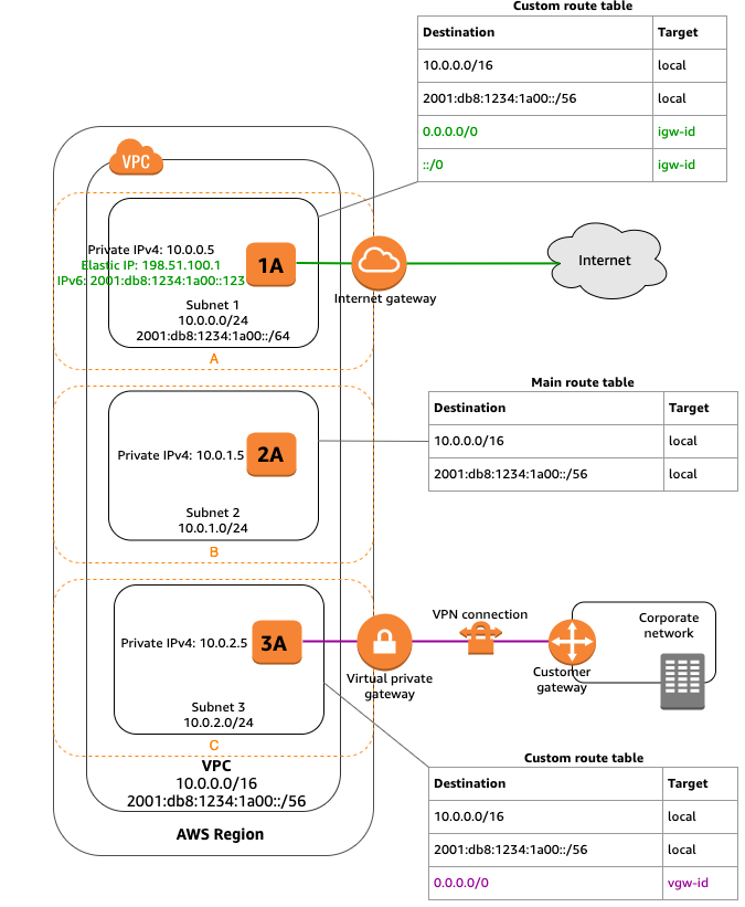 Subnet이 인터넷 게이트웨이에 이르는 경로르 갖고있지는 않지만 그 트래픽이 Site-to-Stie VPN 연결을 위한 가상 Private 게이트웨이로 라우팅되는 경우, 이 Subnet을 VPN 전용 Subnet이라고 한다. 이 그림에선느 Subnet 3이 VPN 전용 Subnet이 된다.