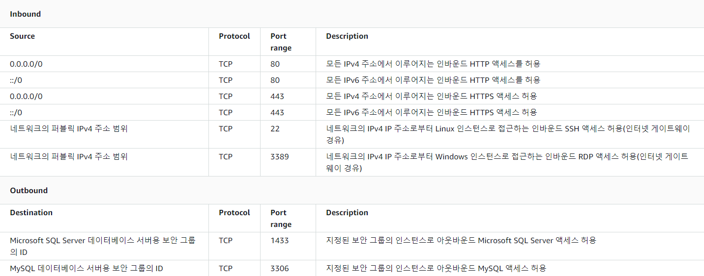 - 기본적으로 보안그룹은 모든 아웃바운드 트래픽을 허용하는 규칙이 포함된다.