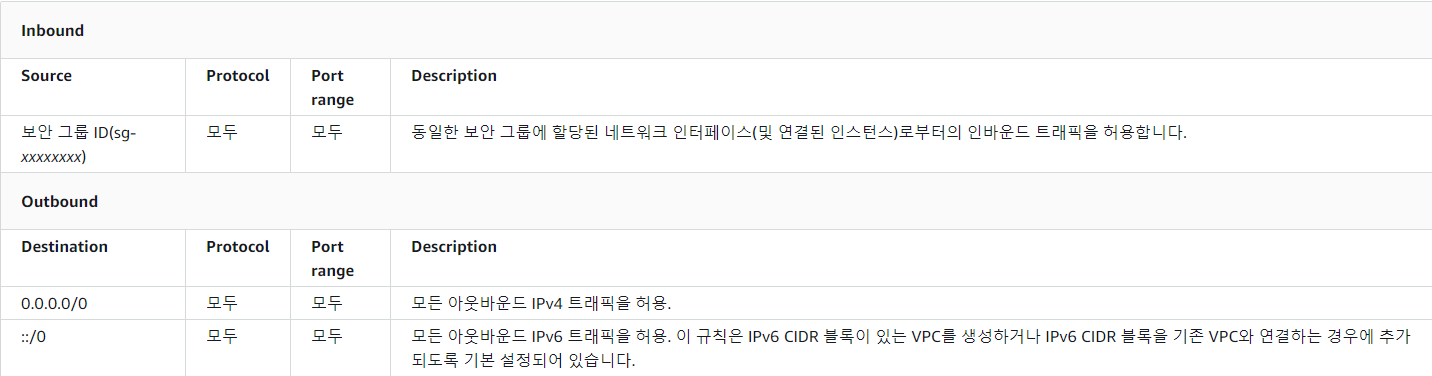 동일 보안그룹에 할당된 네트워크 인터페이스끼리의 통신만 허용되어있고 나머지는 못들어오도록 되어있다! 나가는건 일단 어디로든 다 나갈수있게 되어있다.