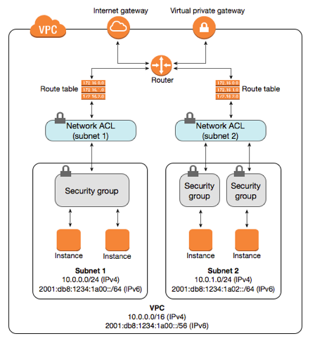 이 다이어그램은 보안그룹과 네트워크 ACL에서 제공하는 보안 계층을 보여준다. 예를 들어, 인터넷 게이트웨이의 트래픽은 라우팅 테이블의 라우팅을 통해 적절한 Subnet으로 라우팅된다. Subnet과 연결된 네트워크 ACL 규칙은 Subnet에 허용되는 트래픽 유형을 제어한다. 인스턴스와 연결된 보안그룹 규칙은 인스턴스에 허용되는 트래픽 유형을 제어한다.