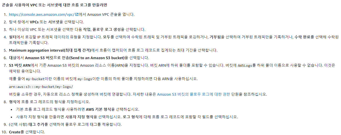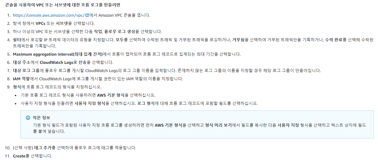 - 흐름 로그를 사용해 VPC의 네트워크 인터페이스에서 송수신되는 IP 트래픽에 대한 정보를 캡처한다.