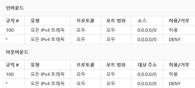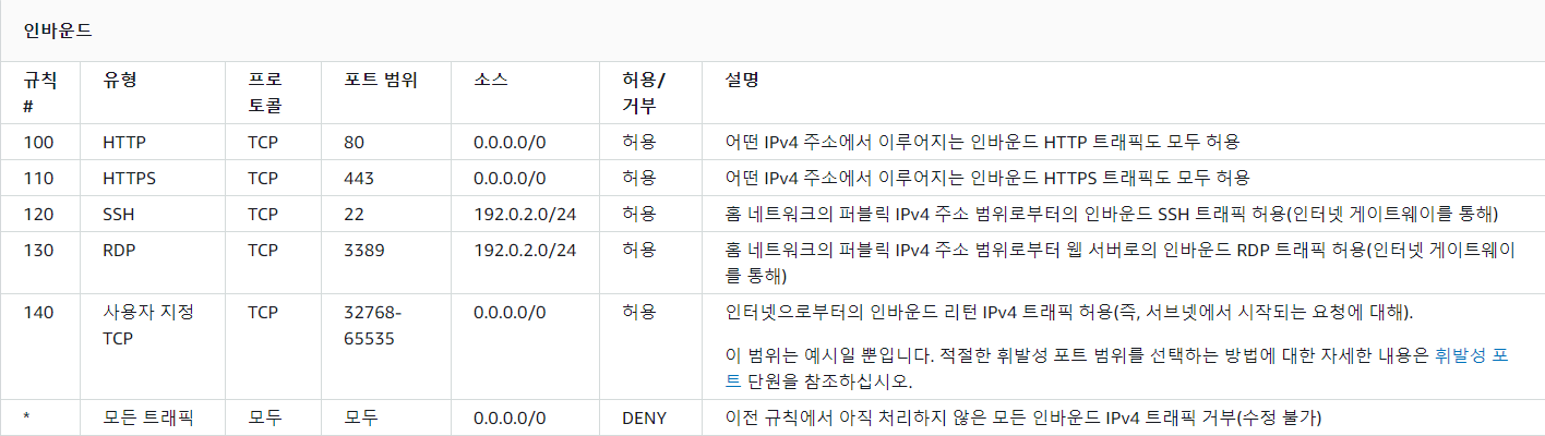 - VPC는 수정 가능한 기본 네트워크 ACL을 제공한다. 기본적으로 인바운드 및 아웃바운드 IPv4 트래픽을 허용한다. 기본 네트워크 ACL을 사용하는지 여부 체크해줘야 겠는데?