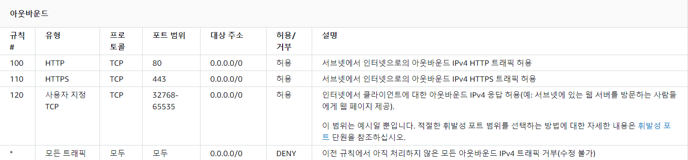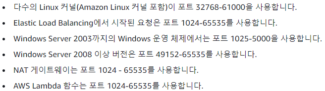 인바운드에 휘발성 포트 규칙을 추가하는건 좀 이해가안되네... (내가 외부로 요청을 보내는 경우에 대한거겠지, 즉, VPC 내부의 인스턴스가 외부로 요청을 보내는 클라이언트 입장일때!!!!) 이런거에 대한 정확한 영역을 잡고있는지, 아니면 잡혀있는지 등에 대한 정보를 체크는 가능할듯.