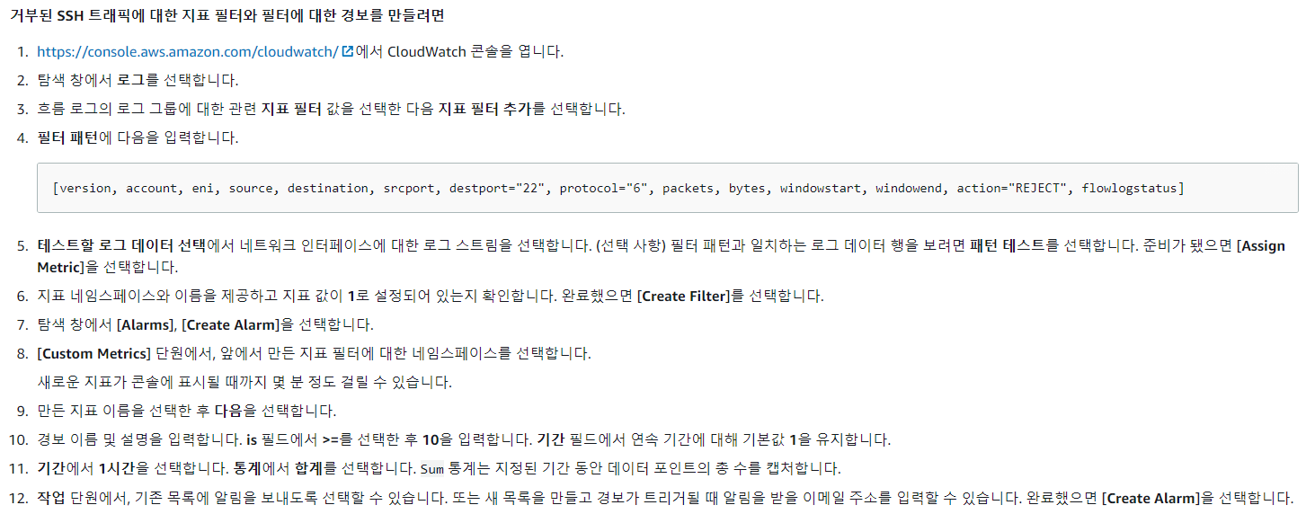 TCP 포트 22를 거쳐 인스턴스에 연결하려는 시도가 한 시간 내에 10번 이상 거부된 경우 이를 알려주는 알림을 만들 수 있다. 우선 경보를 만들려는 트래픽의 패턴과 일치하는 지표 필터를 만들어야 한다.