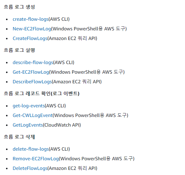 흐름 로그를 생성하고, 확인하고, 레코드 확인, 삭제하는 등의 작업을 AWS CLI로 수행하는 명령어는 다음과 같다. 물론 AWS EC2 Console 화면에서도 수행할 수 있다.