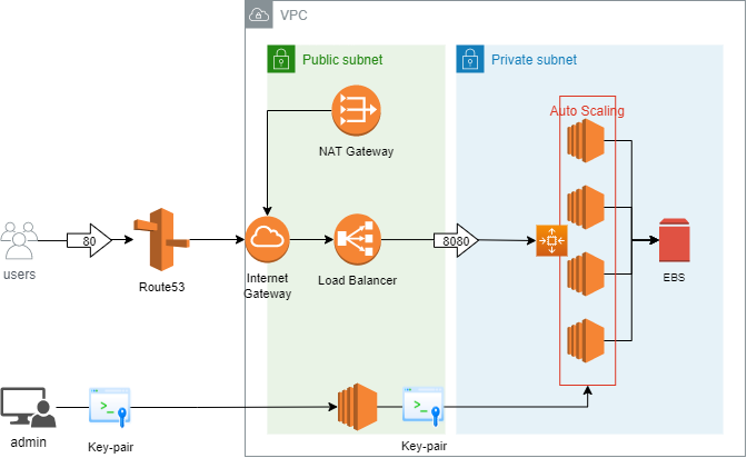 1) 사용자는 80번 포트를 통해 Route53에 Request를 보낸다. (http://example.com:80)