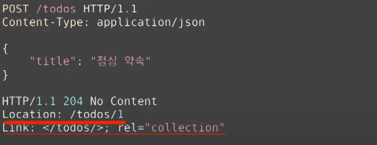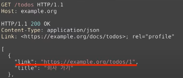 JSON에서도 HATEOAS를 만족할 수 있는 방법은 있는데, 위와 같이 Link 헤더를 사용하는 것이다.