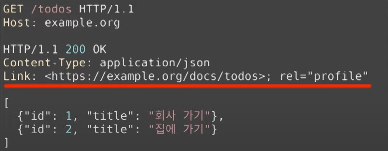 해당 메시지에 대한 명세를 작성하고 Link 헤더에 profile relation으로 해당 명세를 링크한다. 이제 메시지를 보는 사람이 해당 링크를 통해 명세를 확인할 수 있기 때문에 Self-descriptive 제약조건을 성공적으로 지킨 메시지가 된다.