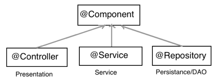 위 그림에서 볼 수 있듯이 각 어노테이션들은 @Component 어노테이션을 상속받고 있다. 이러한 @Controller, @Service, @Repository 어노테이션은 @Component 어노테이션보다 조금 더 구체적이라고만 알고 있으면 될듯 하다.