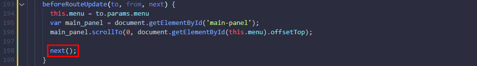 두 번째는 beforeRouteUpdate 함수를 사용하는 방법이 있다. route가 업데이트되기 전에 자동으로 트리거되며 마지막에 3번째 인자로 넘어온 next() 함수를 반드시 호출해줘야 정상적으로 동작한다.