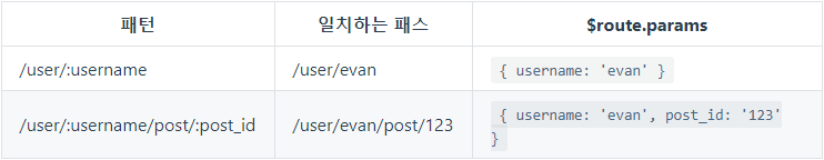 path에 :[Name]을 포함하면 해당 경로를 동적으로 사용할 수 있다. 예를 들어서 /user/1, /user/2, /user/3 등이 올 수 있는 것이다. 이렇게 온 가변인자는 $route.params를 통해 접근할 수 있다.
