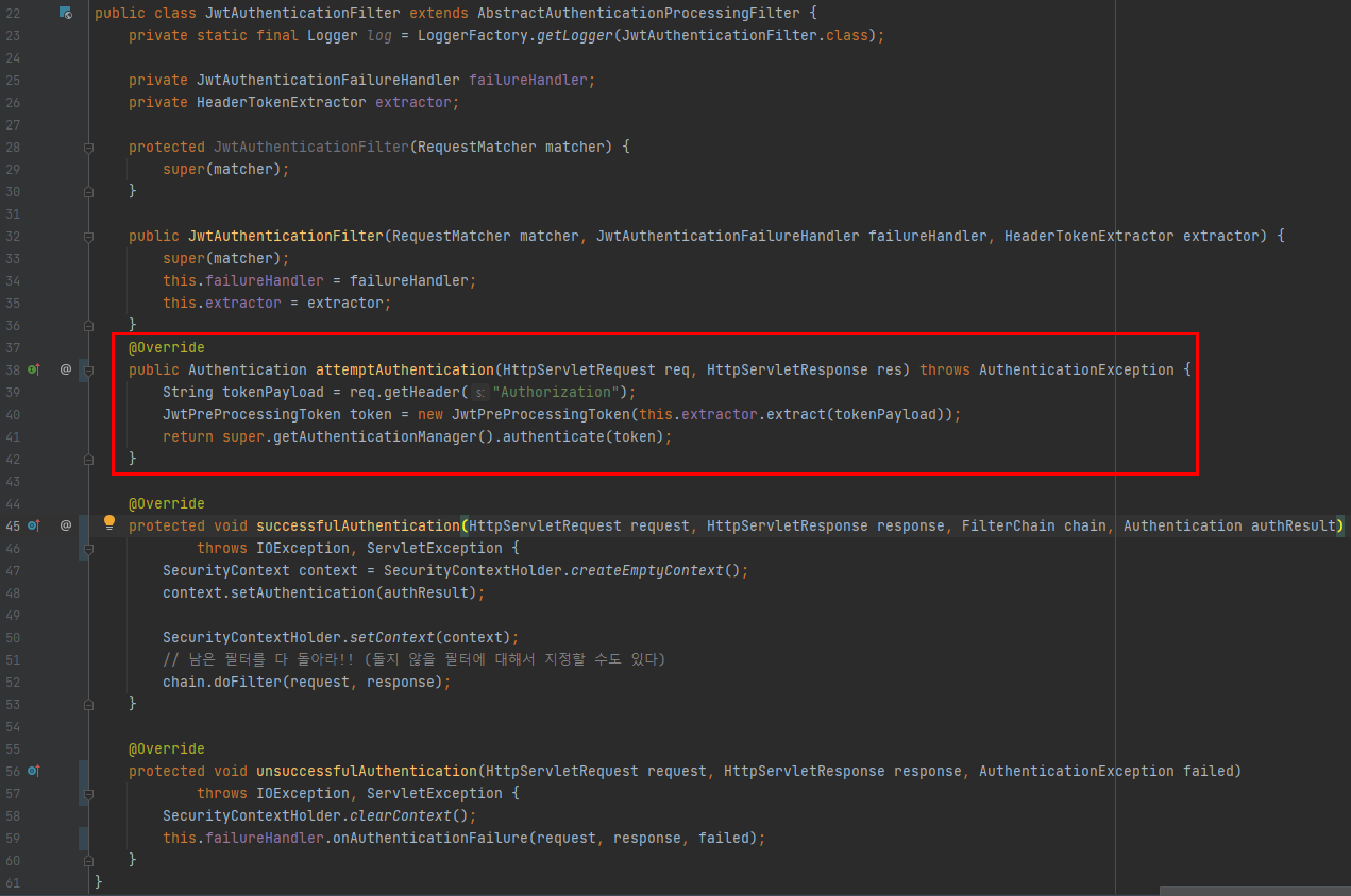 AbstractAuthenticationProcessingFilter 클래스를 상속받아 Filter Chain에 포함시킬 Filter를 만든다. attemptAuthentication, successfulAuthentication, unsuccessfulAuthentication 세 개의 메서드를 기본적으로 오버라이딩 한다.