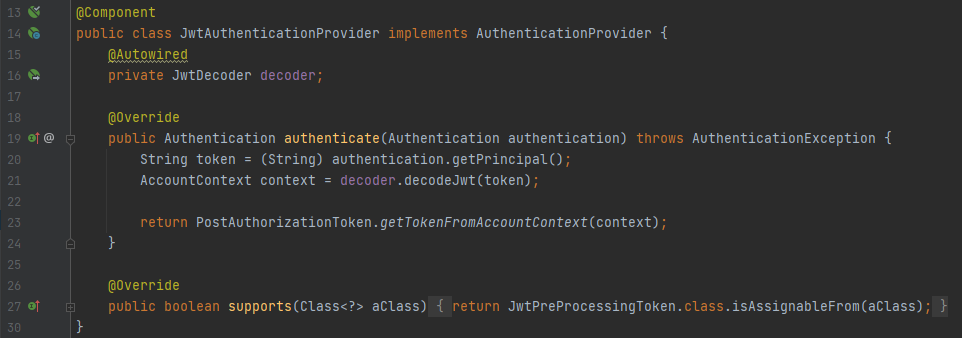 이 내용을 통해 Authentication Provider들이 모여있는 목록에 생성한 JwtAuthenticationProvider를 추가한다. 이렇게 함으로써 해당 Authentication 객체가 인증이 필요할 때 해당 Provider를 사용할 수 있다.