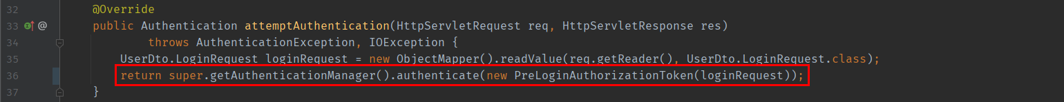 필터에 인터셉트된 로그인 Request는 LoginFilter 클래스의 attemptAuthentication 메서드로 넘어온다. 로그인 정보를 Dto에 저장한 후 super.getAuthenticationManager().authentication() 을 호출해 Authentication Provider를 호출한다.