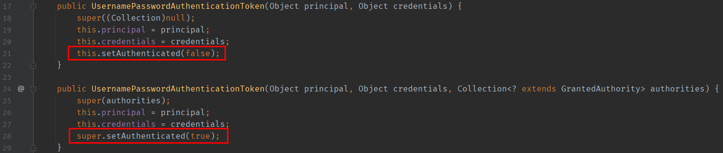 아래와 같이 UsernamePasswordAuthenticationToken 클래스에는 두 가지 생성자가 있다.