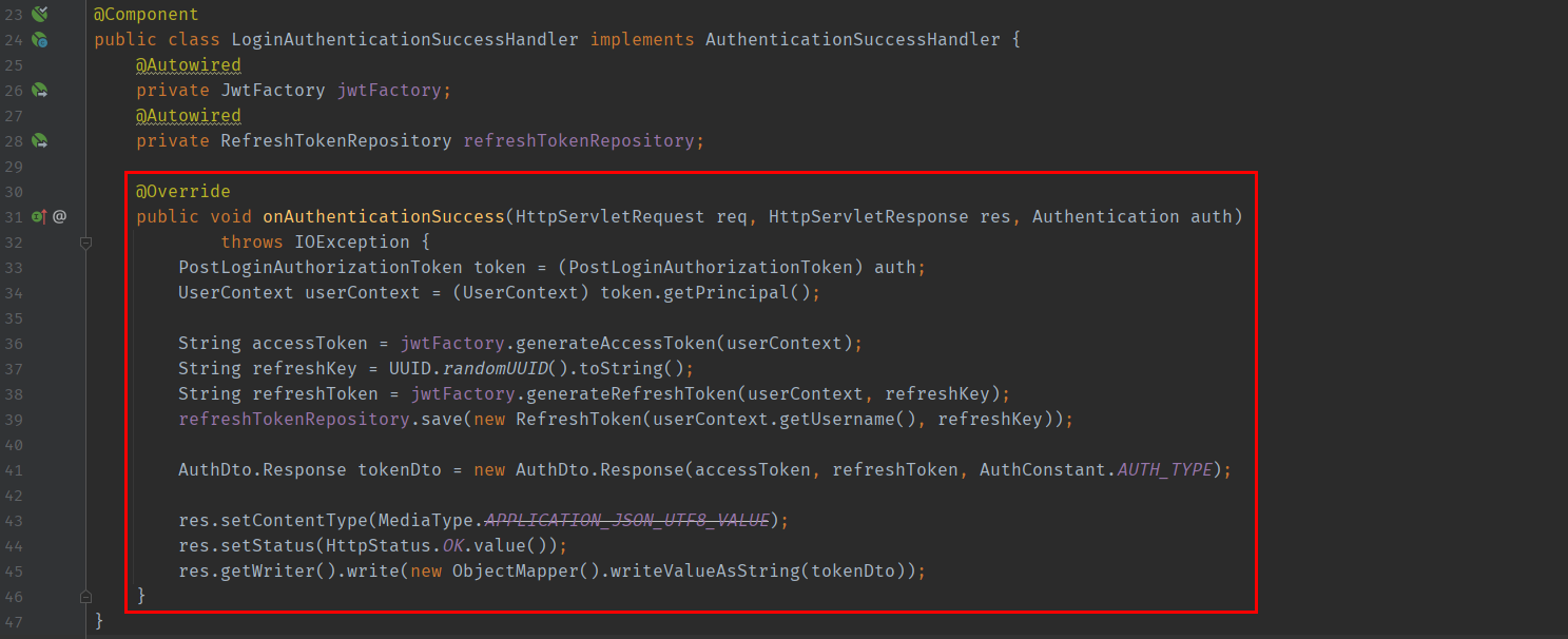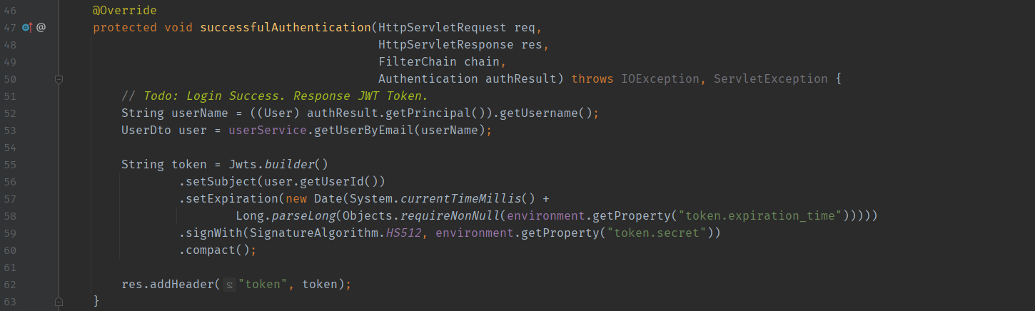 인증에 성공한 경우 JWT Token을 발행하고(발행할 때 Authentication Object에 저장되어 있던 사용자 정보를 활용) 응답값에 포함시켜 돌려준다고 생각하면 된다.