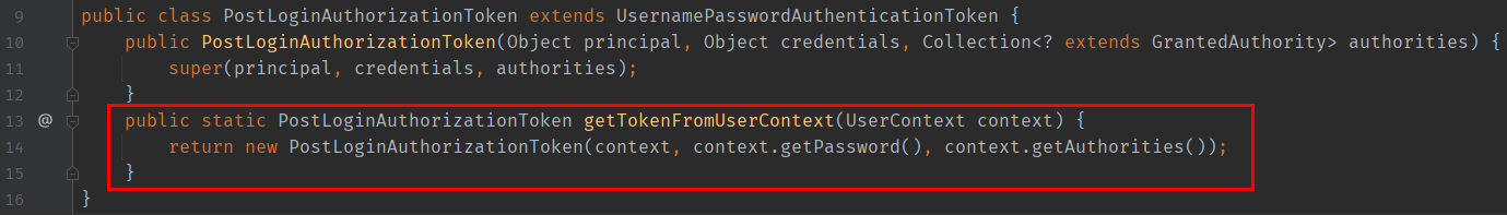 이후 올바른 값이라면 인증된 Token(Authentication Object)을 반환하고 올바르지 않다면 InvalidUserException을 뿌린다. 이때 반환되는 Authentication Object 또한 UsernamePasswordAuthenticationToken 클래스를 상속받은 클래스이다.