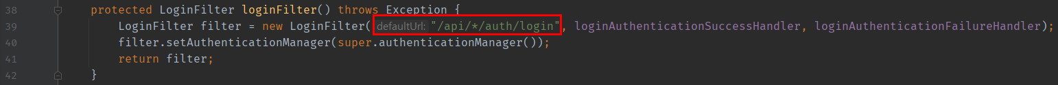 이 AuthenticationFilter는 첫 번째 방법에서 LoginFilter와 동일한 역할을 수행한다. 하지만 여기서는 defaultUrl을 지정해주지 않았다. 그런데도 어떻게 로그인 Request를 식별해고 Filter에서 인터셉트하는지 궁금하다.
