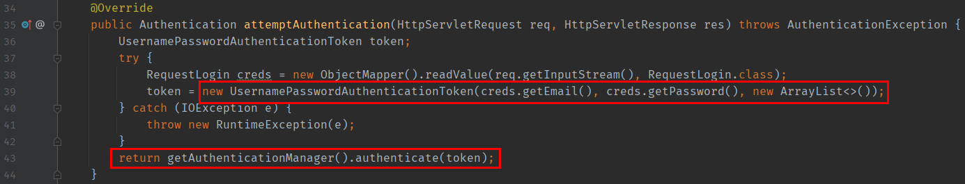 이후에 로그인 Requests는 마찬가지로 Filter의 attemptAuthentication 메서드로 들어온다. 하지만 여기엔 한가지 차이점이 있는데 첫 번째 방법에서는 UsernamePasswordAuthenticationToken을 상속받는 두 가지 Token을 만들어서 사용했다. 하지만 여기선 그냥 사용한다.