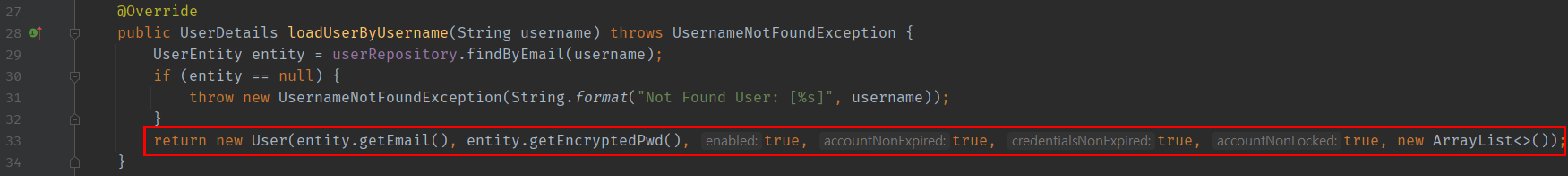 사실 이렇게 UserService에서 처리하기 위해서는 UserService가 UserDetailsService 클래스를 상속받아야 한다. 그리고 UserDetailsService 클래스에 있는 loadUserByUsername() 메서드를 오버라이딩하는 것이다.