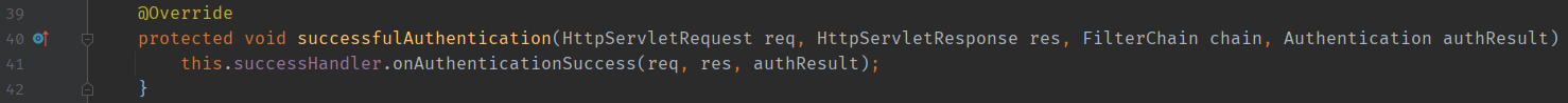 인증에 성공했을 경우 successfulAuthentication() 메서드가 호출된다. 반대로 인증에 실패한 경우는 unsuccessfulAuthnetication() 메서드가 호출된다. 이번 포스팅에서는 인증에 성공한 경우만 살펴보도록 하자.