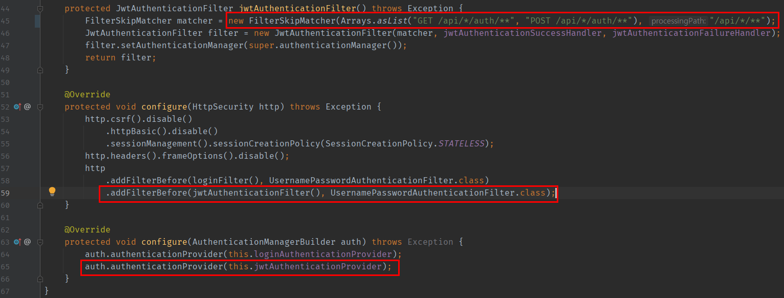기본적으로 Spring Security를 사용해 로그인 시스템을 구현했기 때문에 관련코드와 함께 있다. 첫 번째 네모를 통해 해당 Filter에서 인터셉트할 URL(/api/*/**)와 인터셉트하지 않을 URL들을 정해주도록 구성한다.