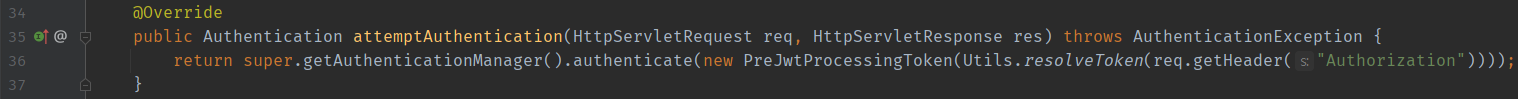 아주 간단하게 HTTP Request의 Header에 Authorization값을 파싱해 UsernamePasswordAuthenticationToken을 상속한 PreJwtProcessingToken 객체(Authentication Object)를 생성해 Authentication Provider로 전송합니다.