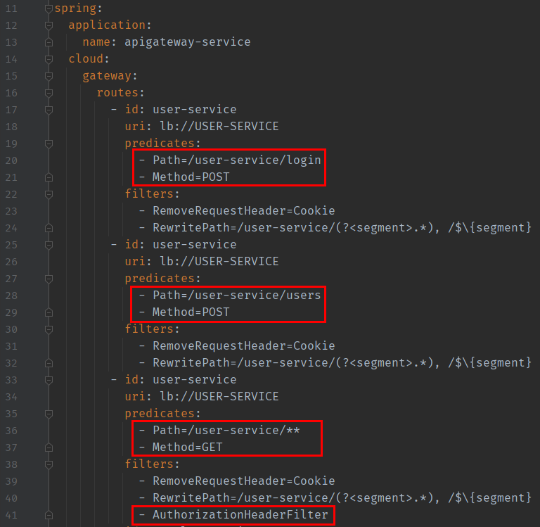 위 코드는 API Gateway 프로젝트에 존재하는 application.yml 파일이다. 위 코드는 API Gateway에 들어온 Request를 어느 서비스로 Routing할지 매핑시켜놓은 테이블이라고 보면 좋을듯 하다.