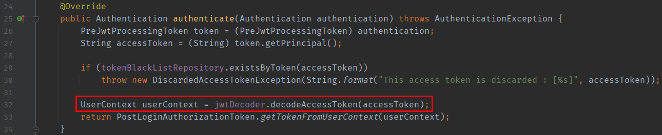 이 과정에서 해당 토큰이 유효한지 판단하고 최종적으로 유효하다면 해당 토큰에 포함되어 있는 정보를 통해 UserContext 객체를 반환한다.