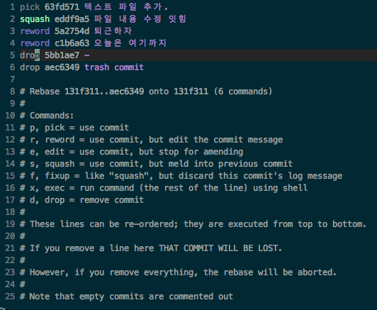 Rebase 에는 꽤 많은 부가적인 명령어를 지원하지만 대표적으로 자주 사용하는 pick, squash, reword, drop 에 대해서만 간단하게 살펴보자. pick 은 가장 기본적으로 설정되며 해당 Commit 을 유지하기 위한 명령어이다. squash 는 해당 Commit 을 바로 앞에 Commit 과 통합하고 Commit 메시지를 새롭게 수정해주는 명령어이다. reword 는 pick 명령어와 유사하지만 Commit 메시지를 수정할 기회가 주어지는 명령어이다. drop 명령어는 간단하게 해당 Commit 을 삭제하는 명령어이다.