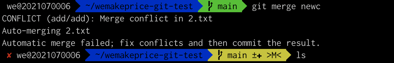위와같이 해당 파일에 Conflict 가 발생한 라인이 표시된다. 해당 파일을 수정한 후(Conflict 를 없앤 후!!!) 다시 add, commit, push, merge 하면 정상적으로 merge가 되는 것을 확인할 수 있다.