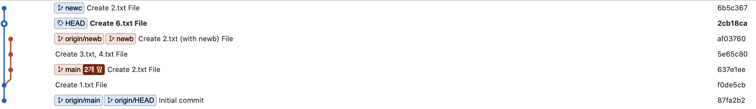 위 이미지에서 Branch 는 origin/main, origin/HEAD, main, origin/newb, newb, HEAD, newc 가 있다.