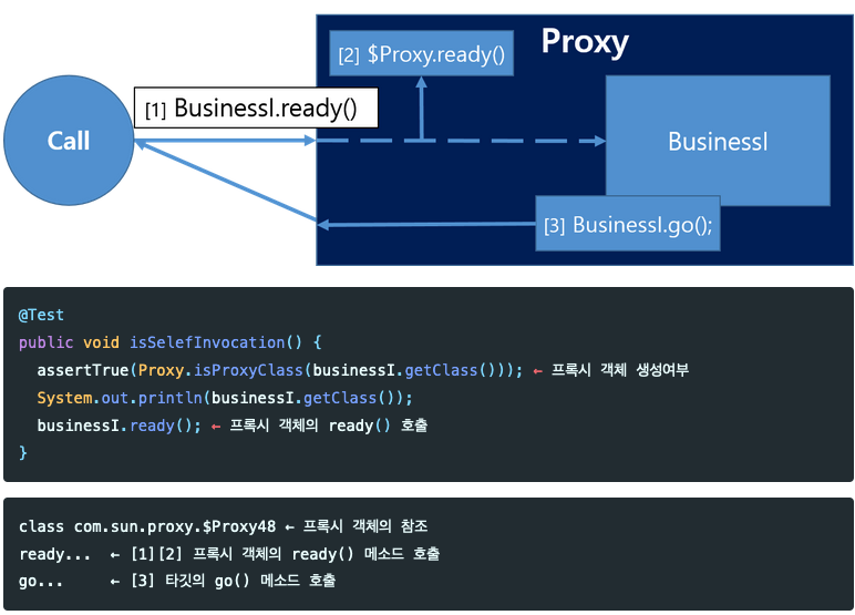 프록시 객체가 해당 메서드 앞뒤에 부가적인 기능(횡단 관심사)를 실행한 후 기존 객체의 메서드를 호출하게 되는 매커니즘으로 동작하게 되는데, 이때 이미 기존객체로 들어와서 거기서 내부 호출이 발생하는 부분에 대해서는 프록시 객체를 거치지 않게된다.