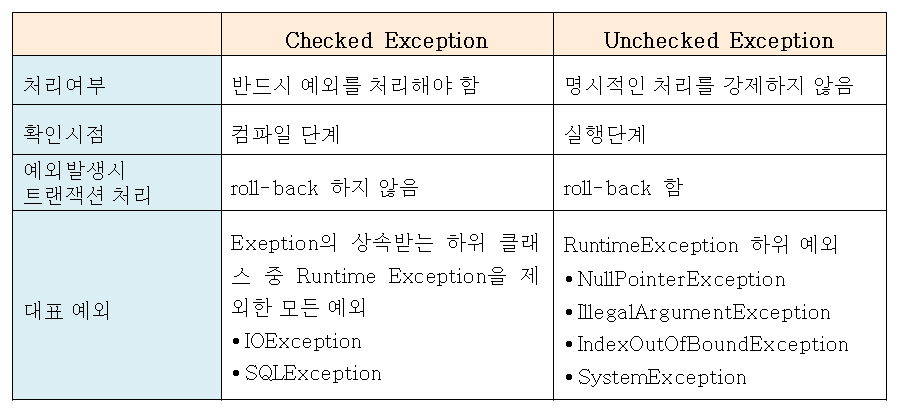 Exception 은 개발자가 구현한 로직에서 발생한다. 즉, 개발자가 Exception 을 미리 예측할 수 있으며 별도의 로직을 추가해 회복과 같은 처리를 해줘야 한다.