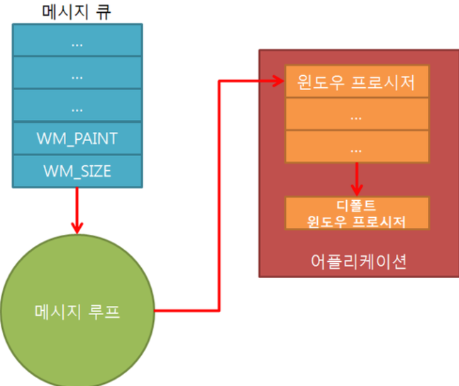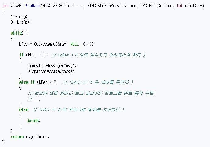 - DispatchMessage() : 메세지를 "윈도우 프로시저"에 전달한다. (Switch-case문으로 구성됨)