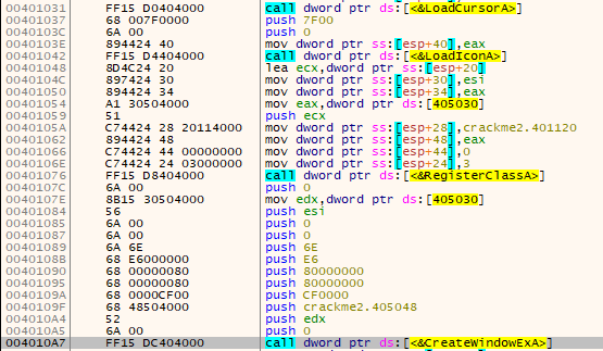 Windows Message Loop 조금 위쪽을 살펴보면 이런 루틴이 존재한다. 여기서 CreateWindowExA는 말 그대로 GUI를 생성해주는 API이다. 그리고 그 바로위 RegisterClassA API를 보면 0x401120을 볼 수 있는데 이 주소가 윈도우 프로시저의 주소이다.