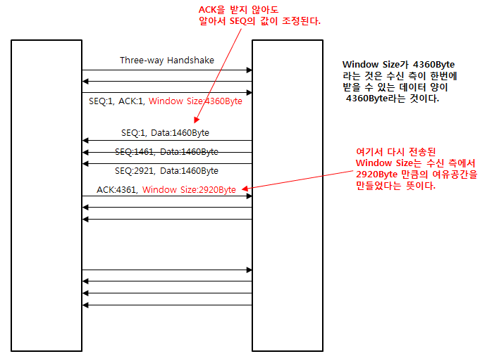 수신사가 수용할 수 있는 데이터 크기(Window Size)를 송신자에게 보낸다. Three-way Handshake 과정에서 보내기 때문에 통신 전에 송신자에게 Window Size에 대한 정보가 들어온다. 그리고 송신자는 수신자에게 Window Size가 넘지 않을 만큼의 패킷을 계속해서 보낸다. 여기서 중요한 점은 여러개의 패킷을 보내도 ACK이 돌아오지 않는다는 점이다.