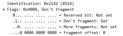 - Don't Fragment : 분할된 패킷에는 0, 분할되지 않은 패킷에는 1이 부여된다.