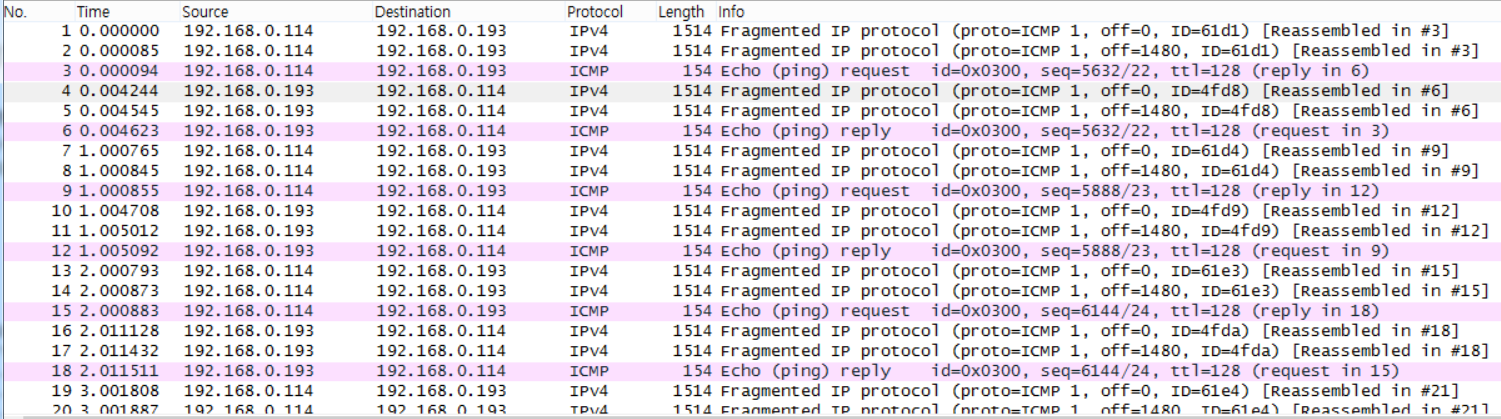 와이어샤크상으로 확인했을 때 위 사진과 같이 패킷이 전송되는 것을 확인할 수 있다.