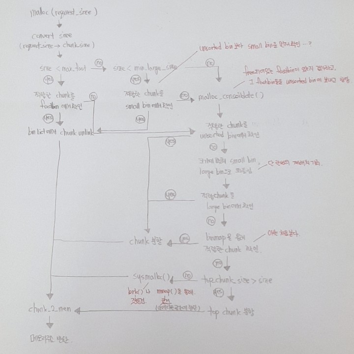 - libc_malloc() → 사용하는 Thread에 맞게 Arena 설정 후, int_malloc()함수 호출.